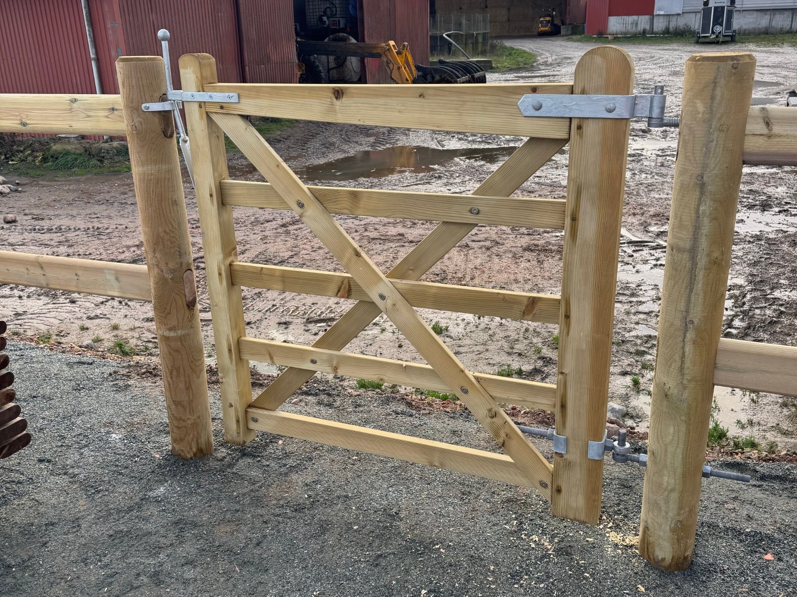 Kompakt trælåge i trykimprægneret fyr. 120 cm bred og 120 cm høj. Ideel til mindre folde, haver og adgangsveje.