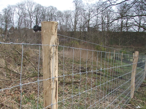 En typisk konstruktion består af net kombineret med solide hegnspæle. Pælene nedrammes i jorden og placeres med jævn afstand, så nettet kan spændes korrekt op. Det er spændingen, der sikrer et lige og stabilt resultat over hele strækningen.