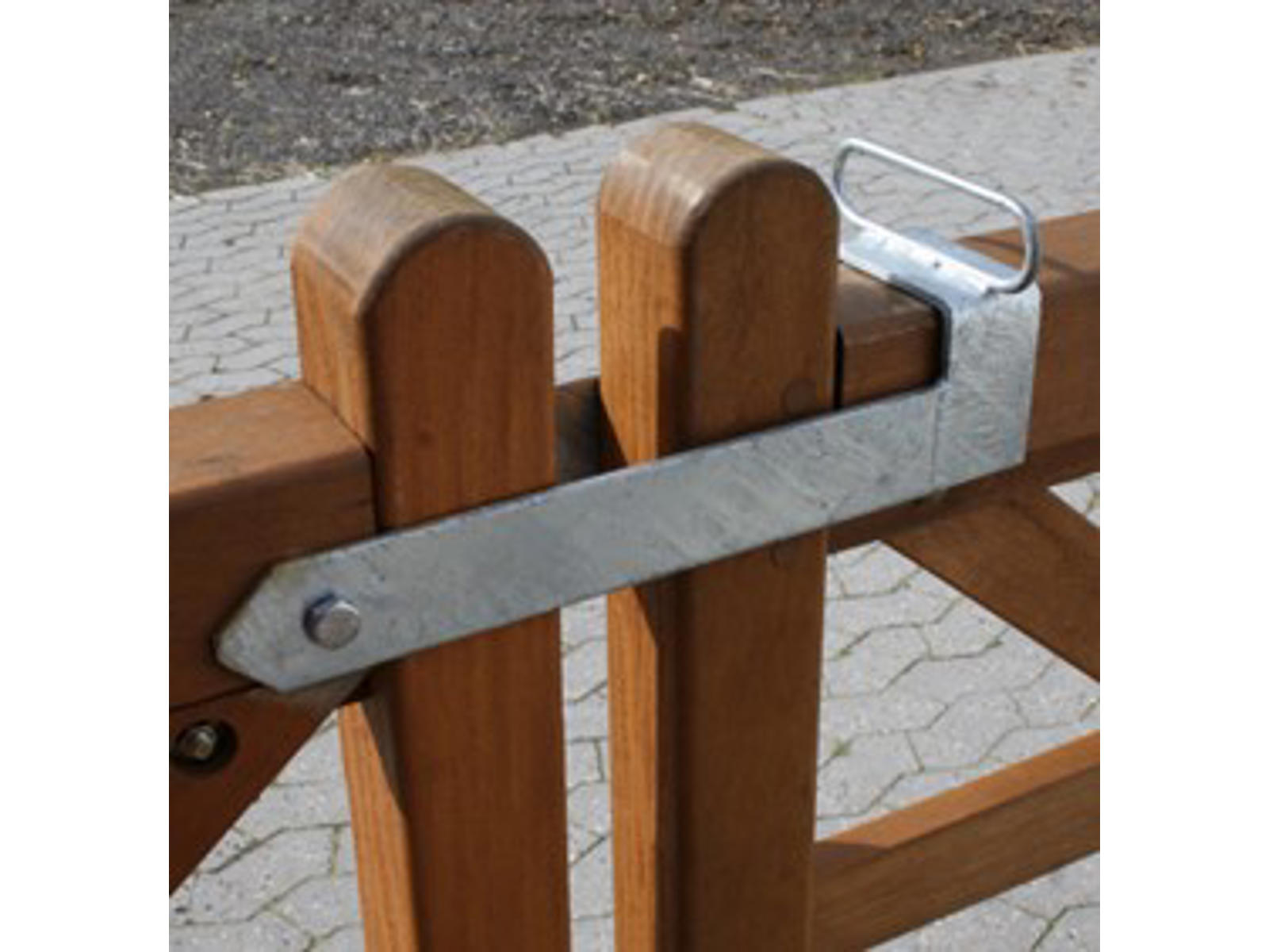Dette overfald bruges til at holde trælåger lukket på en enkel og effektiv måde. Beslaget monteres på lågens bevægelige del og går i indgreb med en fast bøjle eller stabel på modstående stolpe – klar til hængelås, split eller blot som mekanisk lukning. Overfaldet er fremstillet i varmgalvaniseret stål og tåler dermed vind, vejr og daglig brug uden problemer. En robust og klassisk løsning, som passer til både landbrugslåger og havehegn.