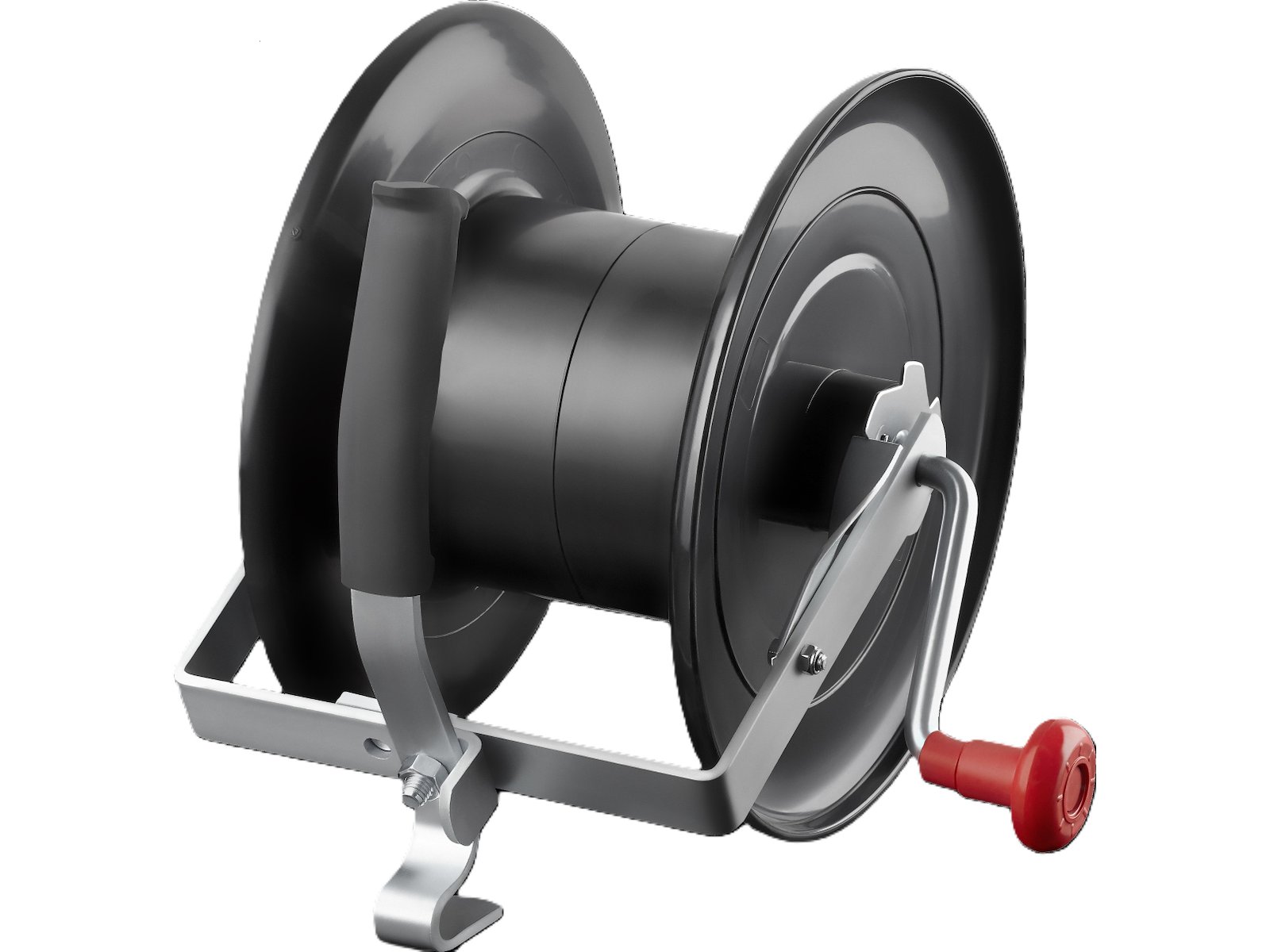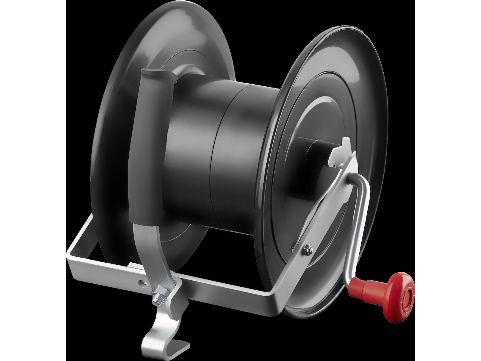 Den holdbare plastkonstruktion og stabile bremsemekanisme sikrer kontrolleret udrulning og oprulning, mens den ergonomiske udformning gør spolen behagelig og let at håndtere – også ved længere arbejdsdage.
